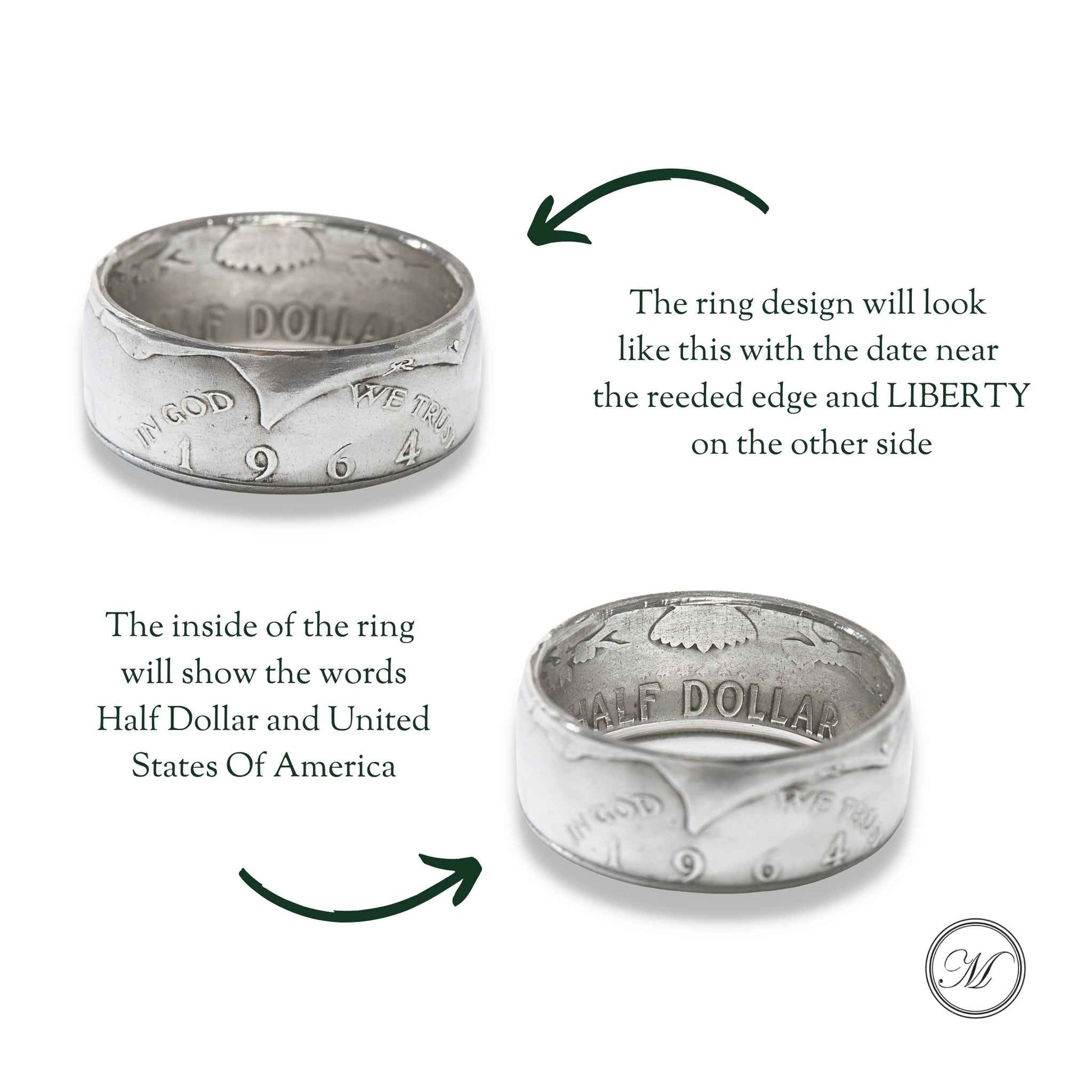 Crafted from 90% silver (a composition used for just one year), these coins became instant collector’s items, hoarded and rarely seen in circulation. Now, they’re reborn as rare, weighty coin rings - forged in memory, worn with pride.